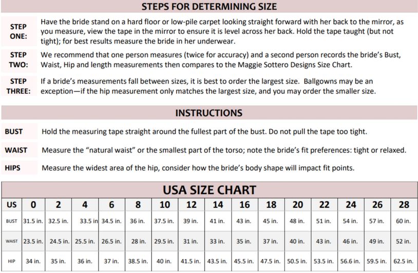 Size Chart with Instructions can be viewed here: Maggie Sottero/Rebecca Ingram Size Chart